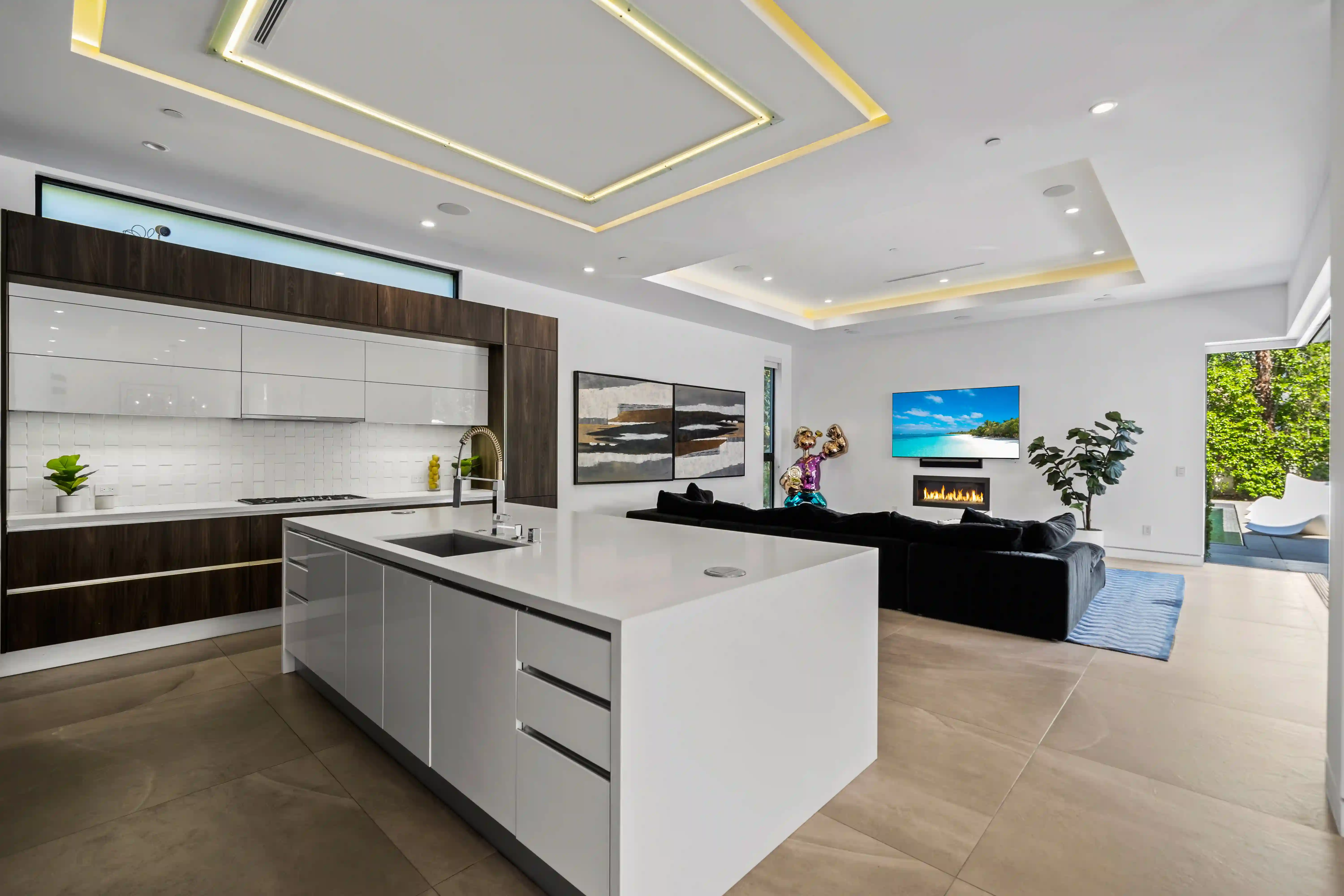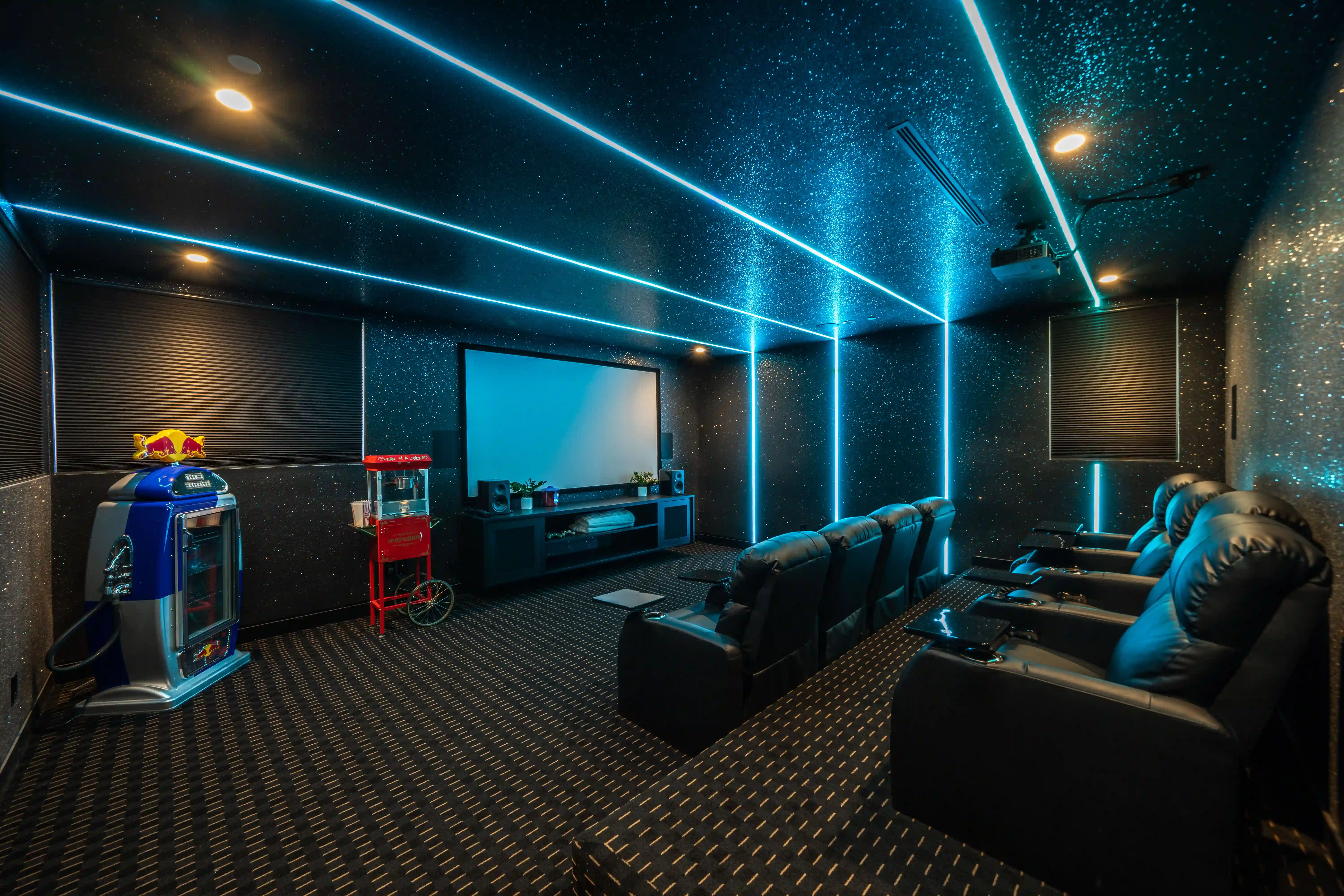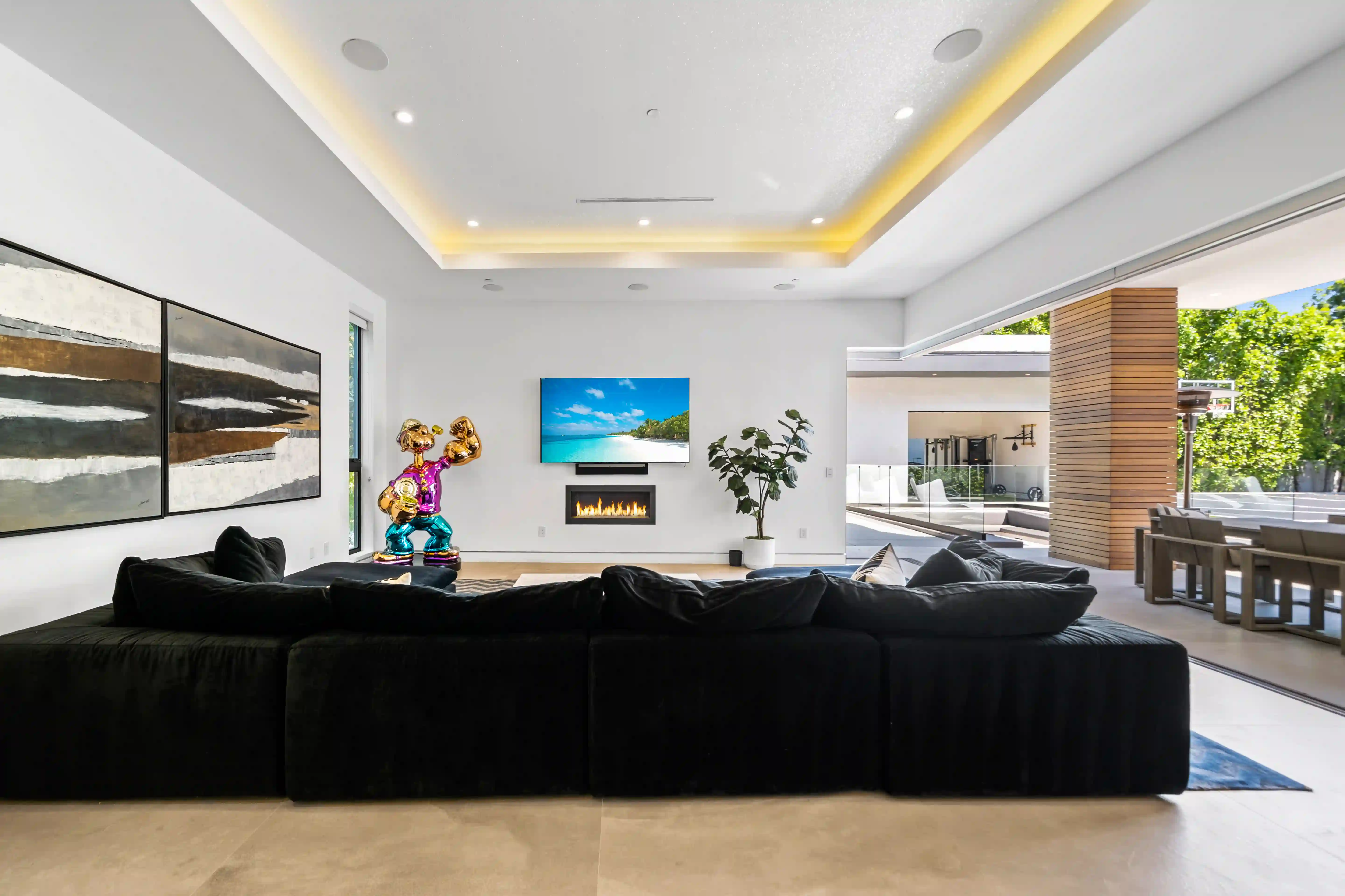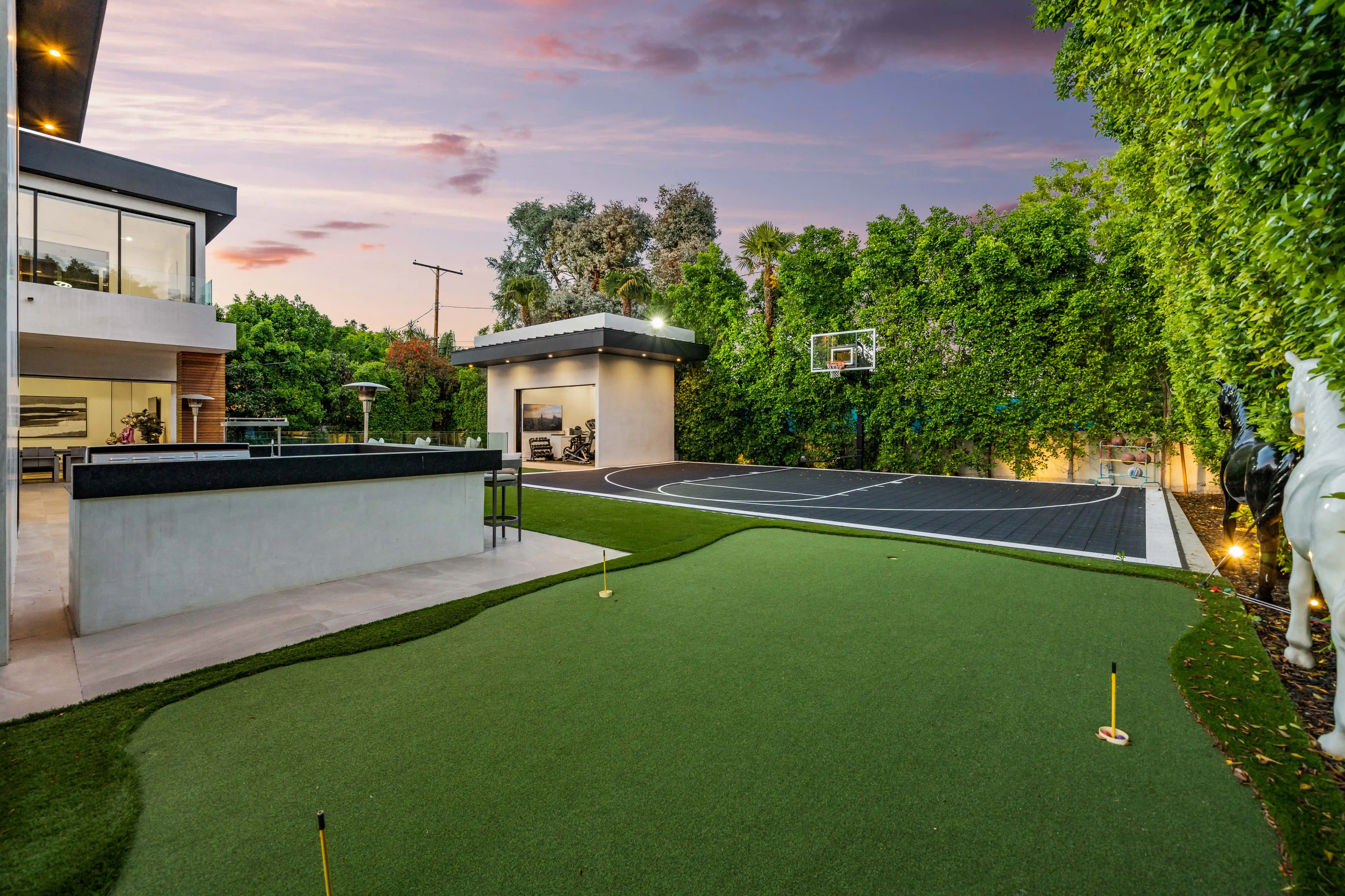 We shot daytime interiors and exteriors plus twilight coverage to highlight the home's dramatic architecture. Drone aerials captured the property layout, basketball court, pool, and neighborhood context. Interior coverage included the open living spaces, chef's kitchen, primary suite, home theater, and spa bathrooms. Twilight shots emphasized the illuminated pool area, exterior facade, and backyard entertainment spaces.